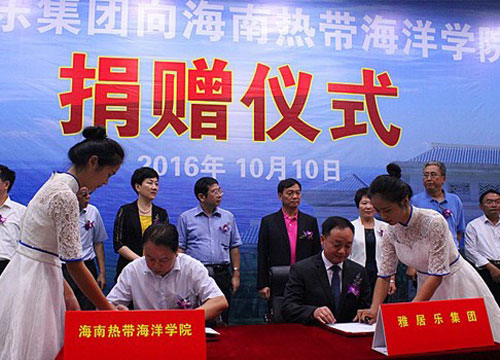 2016年,雅居樂(lè)向海南熱帶海洋學(xué)院捐贈(zèng)1億元人民幣,用于海南熱帶海洋學(xué)院的設(shè)施建設(shè)、科研事業(yè)、優(yōu)秀師生的獎(jiǎng)勵(lì)及貧困師生的救助,以全力推動(dòng)學(xué)校未來(lái)的發(fā)展。該筆捐款是海南教育史上單筆最高額的捐款。海南熱帶海洋學(xué)院黨委書(shū)記韋勇在致辭中表示,學(xué)校一定會(huì)好好利用這筆捐贈(zèng),加快學(xué)校的設(shè)施建設(shè),加大科研投資力度,幫助貧困師生,激勵(lì)優(yōu)秀學(xué)子,爭(zhēng)取將學(xué)校建設(shè)成為“立足海南,服務(wù)南海,面向國(guó)際”的綜合性、應(yīng)用型、有特色的國(guó)際化學(xué)府。